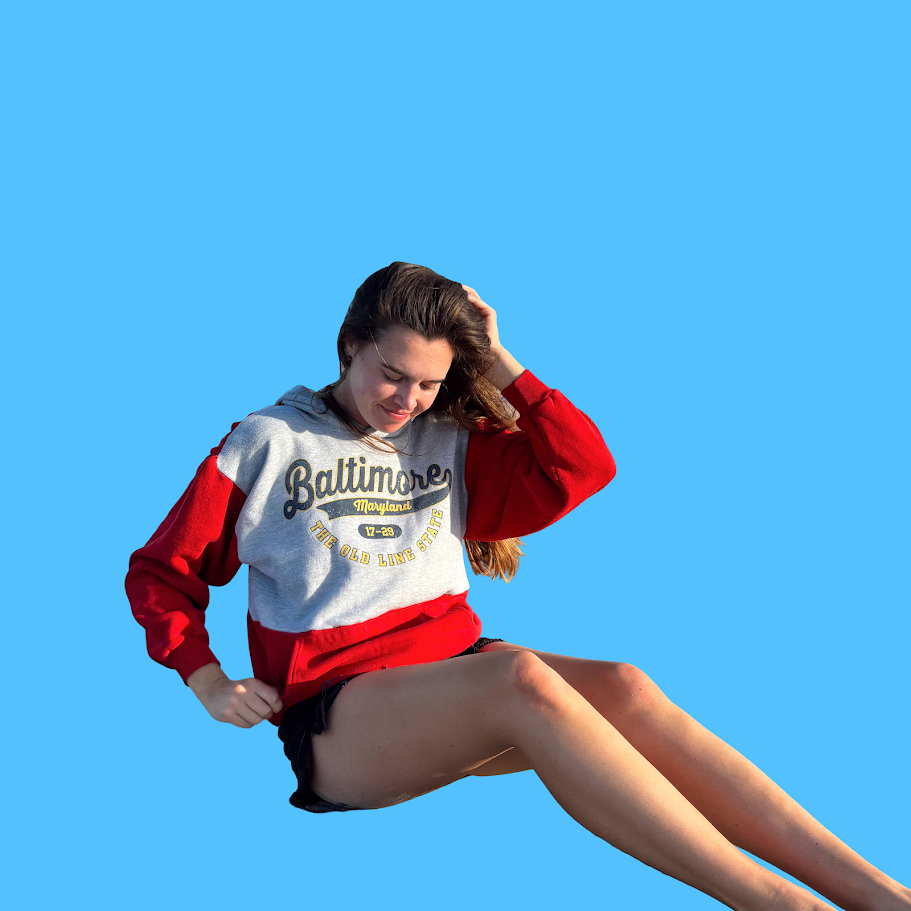 Rep your cozy-core style with this one-of-a-kind upcycled hoodie, pieced together from pre-loved sweatshirts for a fresh new look. Featuring bold red sleeves and a “Baltimore – The Old Line State” graphic, it’s the perfect mix of vintage charm and everyday comfort.