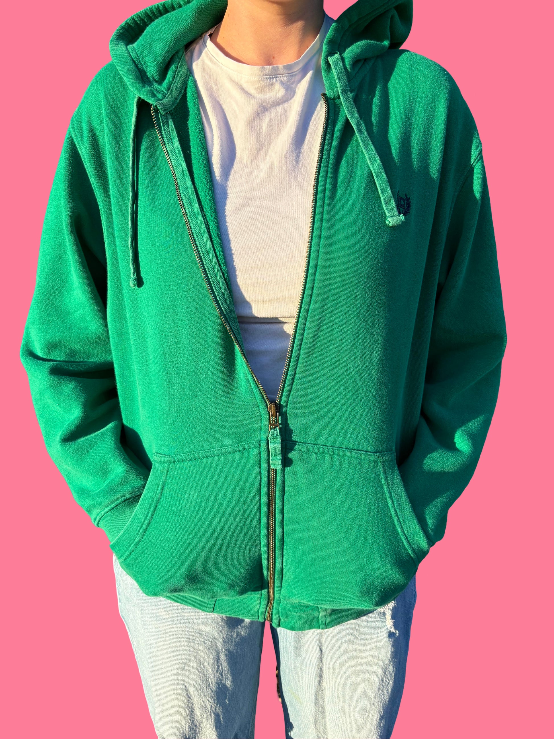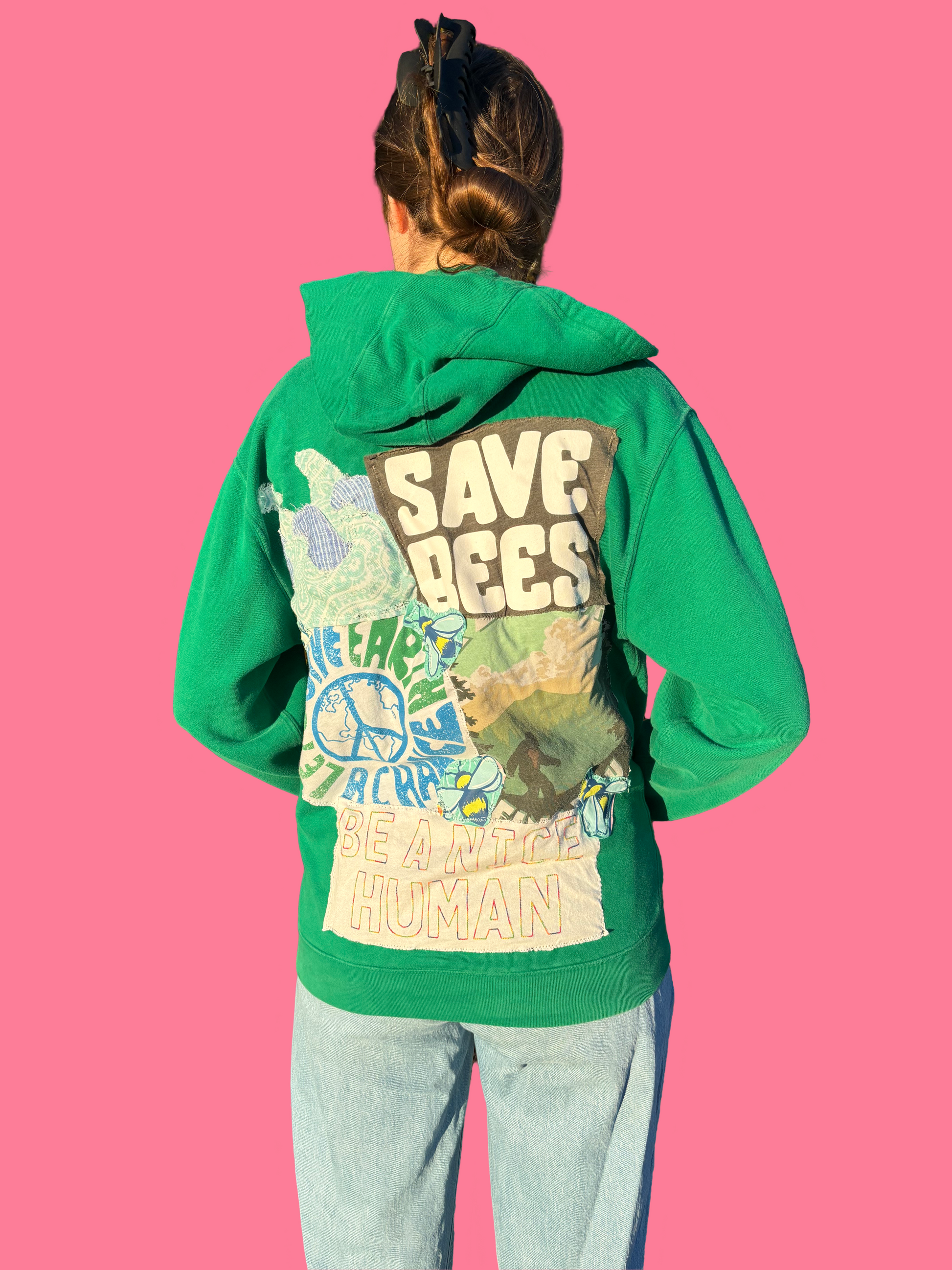 ZipUp green sweatshirt with "save the bees" patches on the back. Size medium.