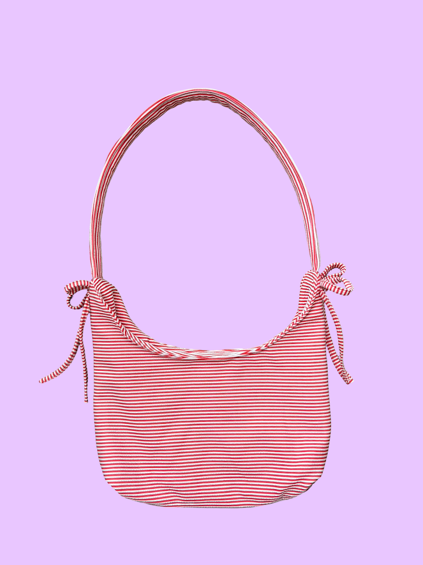 Red and white striped shoulder bag, handmade from rescued fabric.
